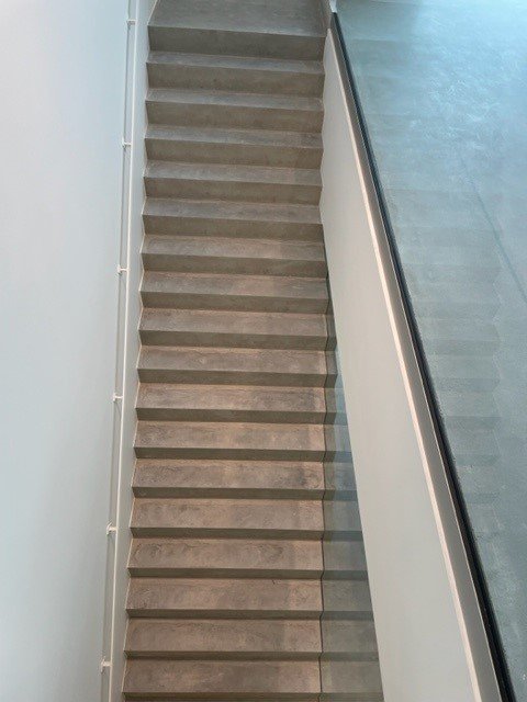 Gepolierde betontrap met onderzijde in blokvorm en uitsparing voor leuning uit glas in Hoogstraten bij Martens Glas